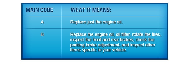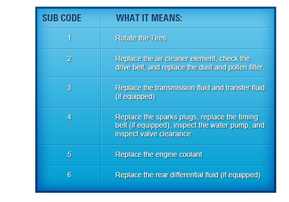 A: | All maintenance items in the display are in code. There are two codes: Main-codes and Sub-codes. Your vehicle will always be due for a main code, and at times for a sub-code. Please refer to your owner's manual, Honda Service History booklet, and the following chart to interpret the code: |
