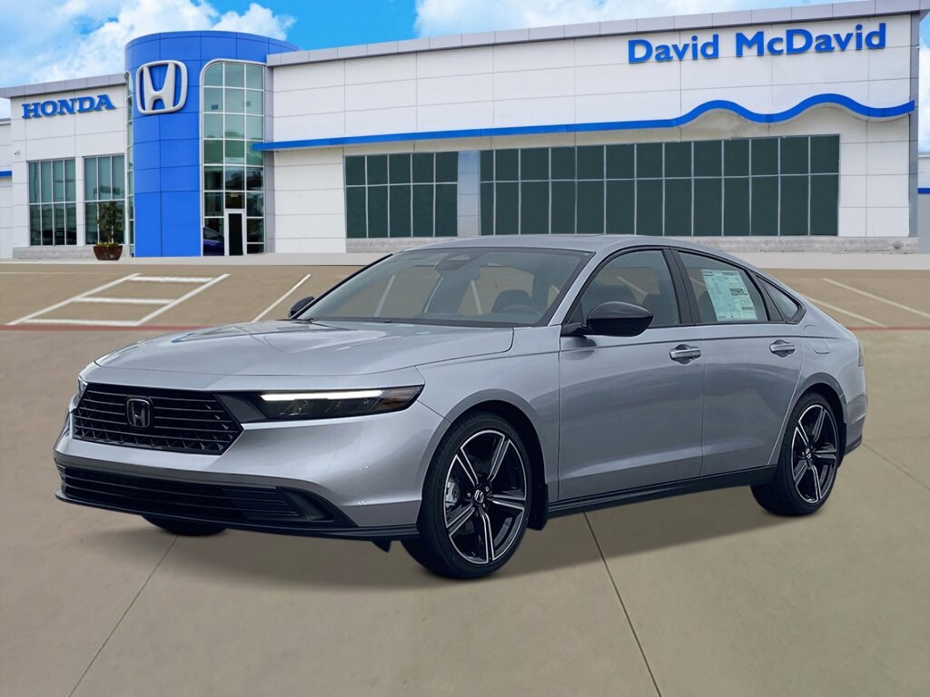 Recent Arrival! This 2026 Honda Accord Hybrid Sport IN-TRANSIT in Solar Silver Metallic comes with the following features: FRESH OIL CHANGE, Completed a 120 vehicle point inspection, and Completed detail 4-Wheel Disc Brakes, 8 Speakers, ABS brakes, Adaptive Cruise Control: Adaptive Cruise Control (ACC) with Low-Speed Follow, Air Conditioning, Alloy wheels, AM/FM radio, Apple CarPlay/Android Auto, Auto High-beam Headlights, Automatic temperature control, Blind Spot Information (BSI) System warning, Brake assist, Bumpers: body-color, Compass, Delay-off headlights, Driver door bin, Driver vanity mirror, Dual front impact airbags, Dual front side impact airbags, Electronic Stability Control, Emergency communication system: HondaLink, Exterior Parking Camera Rear, Fabric Seat Trim, Four wheel independent suspension, Front anti-roll bar, Front Bucket Seats, Front Center Armrest, Front dual zone A/C, Front reading lights, Fully automatic headlights, Heated Front Bucket Seats, Heated front seats, Illuminated entry, Knee airbag, Lane departure: Lane Keeping Assist System (LKAS) active, Leather Shift Knob, Leather steering wheel, Low tire pressure warning, Occupant sensing airbag, Outside temperature display, Overhead airbag, Overhead console, Panic alarm, Passenger door bin, Passenger vanity mirror, Power door mirrors, Power driver seat, Power moonroof, Power steering, Power windows, Radio data system, Radio: 180-Watt Audio System, Rear anti-roll bar, Rear reading lights, Rear seat center armrest, Rear side impact airbag, Rear window defroster, Remote keyless entry, Security system, Speed control, Speed-sensing steering, Speed-Sensitive Wipers, Split folding rear seat, Spoiler, Steering wheel mounted audio controls, Telescoping steering wheel, Tilt steering wheel, Traction control, Trip computer, Variably intermittent wipers, and Wheels: 19 x 8.5J Berlina Black.
