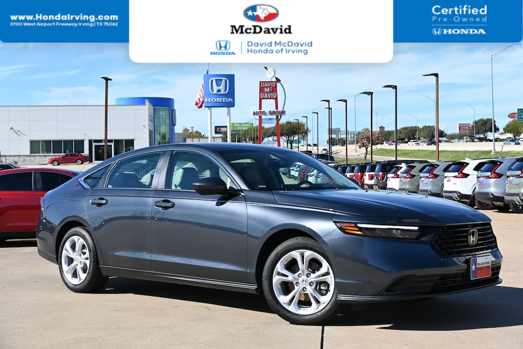 -CERTIFIED- This 2025 Honda Accord Sedan LX looks great with a clean Gray interior and Meteorite Gray Metallic exterior! Bluetooth Keyless Entry Back Up Camera -LOW MILES!- PRICED TO SELL QUICKLY! RESEARCH SUGGESTS IT WILL NOT BE AVAILABLE FOR LONG. -GREAT GAS MILEAGE- If you view our website at: https://www.mcdavidhondairving.com/ you will have access to more photos, the full Value Report and a Vehicle History Report! Please call (469) 405-3340 Call us today to schedule a hassle-free test drive at our Toll Free Number! We are located at: 3700 W Airport Fwy, Irving, TX 75062. For more than 70 years, David McDavid Honda of Irving has been serving the automotive needs of drivers throughout the Dallas Fort Worth Metroplex. We stock a large selection of new and used Honda cars at great prices. If you need assistance with choosing a new car, obtaining financing, or have service and repair questions, our friendly and knowledgeable staff will get your questions answered. Our dealership is located in Irving, but we proudly serve the Dallas, Fort Worth, Arlington, and Grand Prairie and DFW area.