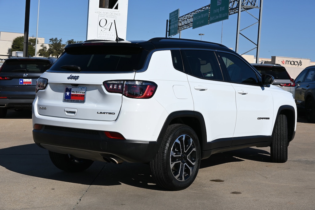CARFAX ONE OWNER! PRICED TO SELL QUICKLY! RESEARCH SUGGESTS IT WILL NOT BE AVAILABLE FOR LONG. This 2022 Jeep Compass Limited has a sharp Bright White Clearcoat exterior and a super clean Black interior! Bluetooth Heated Front Seats Keyless Entry Remote Start Backup Camera leather seats! You can find more information on this Compass on our website: https://www.mcdavidhondairving.com/. Our vehicles are value priced and move quickly. Be sure to call us to confirm availability and to schedule a hassle free test drive (469) 405-3340! We are located at: 3700 W Airport Fwy, Irving, TX 75062. For more than 70 years, David McDavid Honda of Irving has been serving the automotive needs of drivers throughout the Dallas Fort Worth Metroplex. We stock a large selection of new and used Honda cars at great prices. If you need assistance with choosing a new car, obtaining financing, or have service and repair questions, our friendly and knowledgeable staff will get your questions answered. Our dealership is located in Irving, but we proudly serve the Dallas, Fort Worth, Arlington, and Grand Prairie and DFW area.