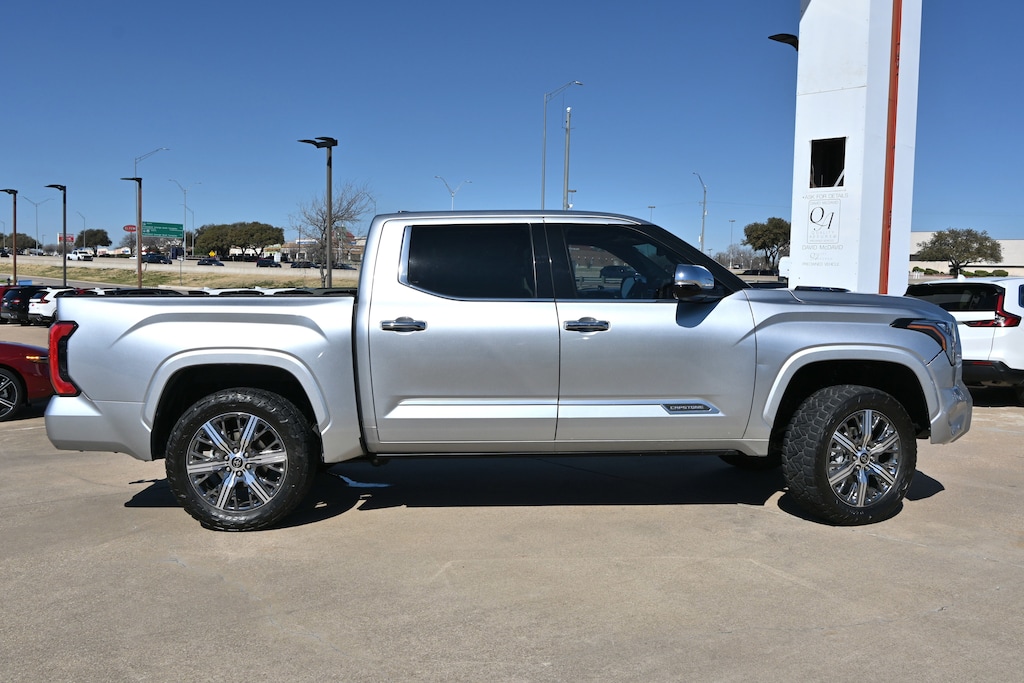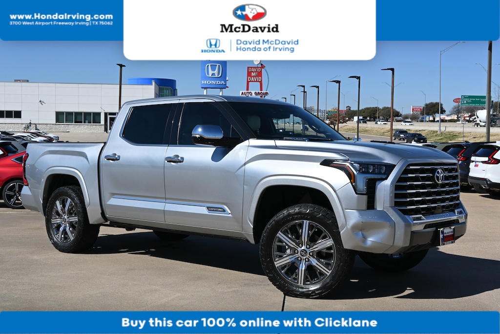-New Arrival- This 2023 Tundra 4WD has a very popular Celestial Silver Metallic exterior color with White that looks fantastic! Bluetooth Heated Front Seats Keyless Entry Backup Camera Navigation Sunroof/ Moonroof PRICED TO SELL QUICKLY! Research suggests it will not be available for long. -Low Mileage- This Celestial Silver Metallic 2023 Toyota Tundra 4WD Capstone Hybrid is priced to sell fast! Please visit our website to view the complete Value Report, Vehicle History Report and to learn more about this Tundra 4WD at https://www.mcdavidhondairving.com/ . David McDavid Honda of Irving prides itself on value pricing its vehicles and exceeding all customer expectations! The next step? Give us a call to confirm availability and schedule a hassle free test drive (469) 405-3340! We are located at: 3700 W Airport Fwy, Irving, TX 75062. For more than 70 years, David McDavid Honda of Irving has been serving the automotive needs of drivers throughout the Dallas Fort Worth Metroplex. We stock a large selection of new and used Honda cars at great prices. If you need assistance with choosing a new car, obtaining financing, or have service and repair questions, our friendly and knowledgeable staff will get your questions answered. Our dealership is located in Irving, but we proudly serve the Dallas, Fort Worth, Arlington, and Grand Prairie, and DFW area.
